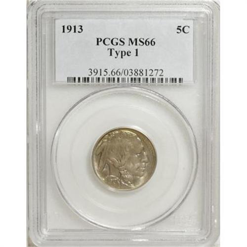 <B>1913 5C Type One MS66 PCGS.</B></I> PCGS Population (1401/358). NGC Census: (1087/234). Mintage: 30,993,520. Numismedia Wsl. Price for NGC/PCGS coin in MS66: $254. (#3915)<BR><BR><B>Coin Engraver:</B> James E. Fraser<BR><BR><b>Shipping:</b> Coins & Currency (<a target="_blank" href="http://www.heritageauctions.com/common/shipping.php">view shipping information</a>\)