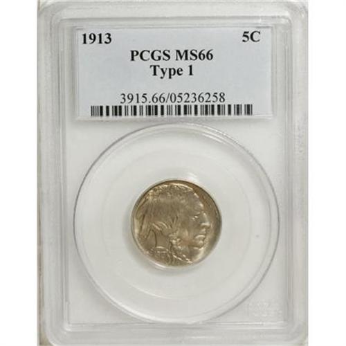 <B>1913 5C Type One MS66 PCGS.</B></I> PCGS Population (1401/358). NGC Census: (1087/234). Mintage: 30,993,520. Numismedia Wsl. Price for NGC/PCGS coin in MS66: $254. (#3915)<BR><BR><B>Coin Engraver:</B> James E. Fraser<BR><BR><b>Shipping:</b> Coins & Currency (<a target="_blank" href="http://www.heritageauctions.com/common/shipping.php">view shipping information</a>\)