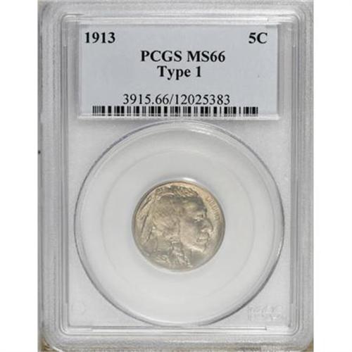 <B>1913 5C Type One MS66 PCGS.</B></I> PCGS Population (1448/377). NGC Census: (1095/242). Mintage: 30,993,520. Numismedia Wsl. Price for NGC/PCGS coin in MS66: $254. (#3915)<BR><BR><B>Coin Engraver:</B> James E. Fraser<BR><BR><b>Shipping:</b> Coins & Currency (<a target="_blank" href="http://www.heritageauctions.com/common/shipping.php">view shipping information</a>)