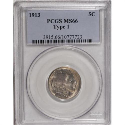 <B>1913 5C Type One MS66 PCGS.</B></I> PCGS Population (1479/381). NGC Census: (1103/247). Mintage: 30,993,520. Numismedia Wsl. Price for NGC/PCGS coin in MS66: $254. (#3915)<BR><BR><B>Coin Engraver:</B> James E. Fraser<BR><BR><b>Shipping:</b> Coins & Currency (<a target="_blank" href="http://www.heritageauctions.com/common/shipping.php">view shipping information</a>)
