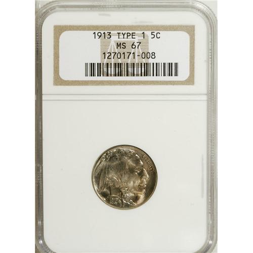 <B>1913 5C Type One MS67 NGC.</B></I> The strike is sharp and the luster is satiny with plenty of texture in the fields. An incredible example for this classic one-year type issue, where wonderful eye appeal is the norm.<BR><BR><b>Shipping:</b> Coins & Currency (<a target="_blank" href="http://www.heritageauctions.com/common/shipping.php">view shipping information</a>)