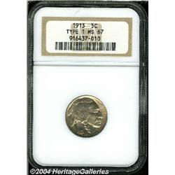 <B>1913<5C> Type One MS67 NGC.</B></I> Well struck, save for minor weakness on the bison's head, with rich gleaming luster over the beautifully preserved, essentially untoned surfaces. A distinctly granular, orange-peel texture is apparent on both sides, more prominently so on the reverse. <BR><BR><B>Important notice:</B> Heritage usually auctions material at the rate of 200-250 lots per hour. On some occasions eBay Live bid software or the Internet may not be able to keep up with the pace of the auction. We recommend placing a realistic absentee bid now as insurance to avoid disappointment. Occasionally the auctioneer may eliminate or reject an eBay Live bid, and the auctioneer may also reopen a lot after the close of the eBay live bidding (usually because we missed an audience bid), and may reject your bid even if it shows you as the winning bidder. By bidding via eBay Live, you agree that Heritage may award the lot to another bidder at its sole discretion under the circumstances described above or any other reasonable circumstances. Since eBay bids are not shown to us until we open the lot on the floor, we treat those bids just like floor bids. In most cases the floor responds before the eBay bid is presented to us, due to Internet lag time, so for consistency we have made it a policy that floor bids are always considered first over tie eBay live bids. Also please note that all Heritage lots purchased through eBay Live carry a 20% Buyer's Premium. Please make sure you read the Terms and Conditions before you bid.