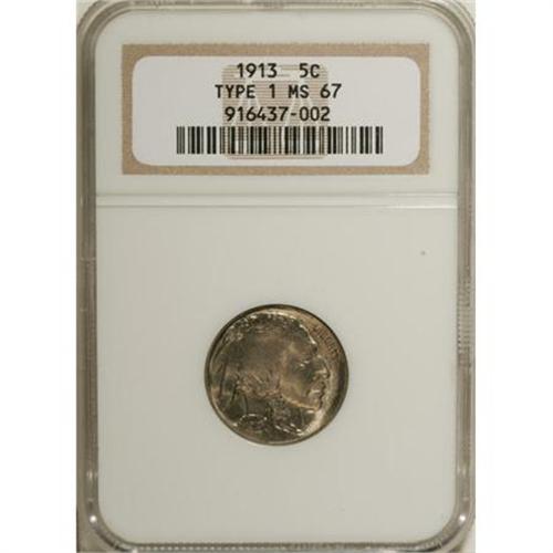 <B>1913 5C Type One MS67 NGC.</B></I> A splendid gold-tinged example of the famous one-year Type One design, well-defined with effusive luster and only the tiniest of flaws. NGC has graded just nine coins finer (5/07).<BR><I>From The Vanek Collection.</B></I><BR><BR><b>Shipping:</b> Coins & Currency (<a target="_blank" href="http://www.heritageauctions.com/common/shipping.php">view shipping information</a>)