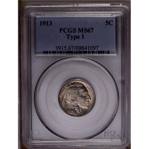 <B>1913<5C> Type One MS67 PCGS.</B></I> A lovely type coin that is always in demand, especially in such superlative condition. This piece is superbly struck with full luster and orange-peel fields. Hints of gold toning enhance the eye appeal. The reverse is slightly rotated, of interest to specialists.