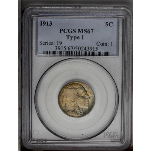 <B>1913<5C> Type One MS67 PCGS.</B></I> A sharply struck and fully lustrous example of the first Buffalo nickel design, featuring the bison standing on a mound or bluff, overlooking the territory behind and below. Mostly medium gold color with lighter gray at the right obverse. <BR><BR><B>Important notice:</B> Heritage usually auctions material at the rate of 200-250 lots per hour. On some occasions eBay Live bid software or the Internet may not be able to keep up with the pace of the auction. We recommend placing a realistic absentee bid now as insurance to avoid disappointment. Occasionally the auctioneer may eliminate or reject an eBay Live bid, and the auctioneer may also reopen a lot after the close of the eBay live bidding (usually because we missed an audience bid), and may reject your bid even if it shows you as the winning bidder. By bidding via eBay Live, you agree that Heritage may award the lot to another bidder at its sole discretion under the circumstances described above or any other reasonable circumstances. Since eBay bids are not shown to us until we open the lot on the floor, we treat those bids just like floor bids. In most cases the floor responds before the eBay bid is presented to us, due to Internet lag time, so for consistency we have made it a policy that floor bids are always considered first over tie eBay live bids. Also please note that all Heritage lots purchased through eBay Live carry a 20% Buyer's Premium. Please make sure you read the Terms and Conditions before you bid. This lot is being auctioned in conjunction with a live floor auction by Heritage Galleries & Auctioneers. All final auction and invoice information will be supplied by Heritage Galleries & Auctioneers, and all other information should be considered preliminary. Lot:1028 <BR><BR><B>Winning Notification and Billing:</B> After the FINAL session in this auction is complete, Heritage will send e-mail and snail mail invoices. This process normally takes several days. All final auction and invoice information will be supplied by Heritage Galleries & Auctioneers, and all other information should be considered preliminary. <BR><BR>This auction will be conducted on a live auction floor and over the Internet through eBay Live. If you choose to place an absentee bid, please take a moment to <font color='#0000ff'><u><a href='http://pages.ebay.com/liveauctions/help/before/laabsentee.html'>learn how eBay Live absentee bidding works</a></u></font><font color='#000000'>
