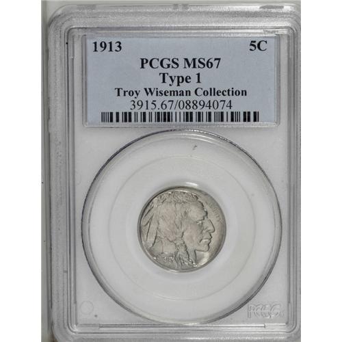 <B>1913<5C> Type One MS67 PCGS.</B></I> The unfinished medal-style background and the bison's mound are bold and clear on this lovely Superb Gem. A lustrous piece with charming champagne patina.<BR><I>From The Troy Wiseman Collection.</B></I>