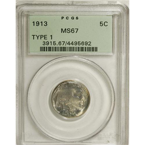 <B>1913 5C Type One MS67 PCGS.</B></I> Ice-blue and olive patina embrace this satiny and sharply impressed Superb Gem. The obverse die is worn, which causes an orange-peel texture throughout the field. Encased in a green label holder.<BR><BR><b>Shipping:</b> Coins & Currency (<a target="_blank" href="http://www.heritageauctions.com/common/shipping.php">view shipping information</a>)