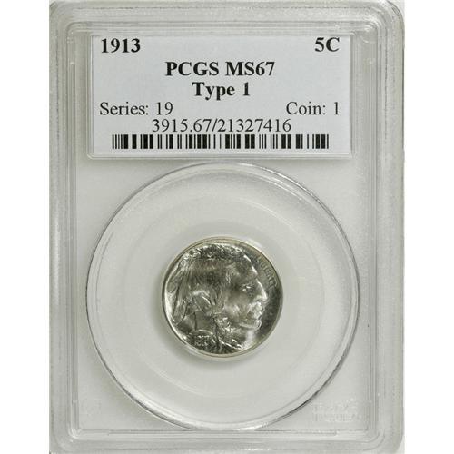 <B>1913 5C Type One MS67 PCGS.</B></I> Lovely sky-blue, rose-gray, and gold toning decorates the intensely lustrous surfaces of this Superb Gem, from the first year of the Buffalo nickel series. Well struck and pristine.<BR><BR><b>Shipping:</b> Coins & Currency (<a target="_blank" href="http://www.heritageauctions.com/common/shipping.php">view shipping information</a>)