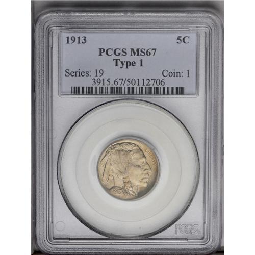 1913 5C Type One MS67 PCGS. Lustrous surfaces are beau 1913[5C] Type One MS67 PCGS.