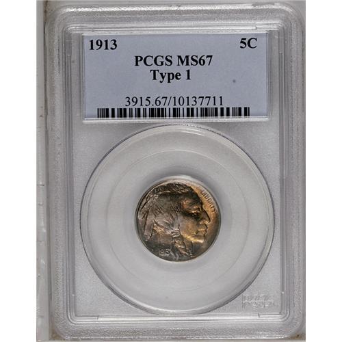<B>1913<5C> Type One MS67 PCGS.</B></I> This luxurious Superb Gem's yellow and lavender surfaces have great luster. A wonderful type set candidate; PCGS has certified only eight examples finer (7/06).