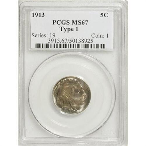 <B>1913 5C Type One MS67 PCGS.</B></I> Beautiful original luster dances about this lightly toned Type One Buffalo nickel. While plentiful in Mint State 67, few examples are available in any finer state of preservation. <BR><BR><B>Coin Engraver:</B> James E. Fraser<BR><BR><b>Shipping:</b> Coins & Currency (<a target="_blank" href="http://www.heritageauctions.com/common/shipping.php">view shipping information</a>)