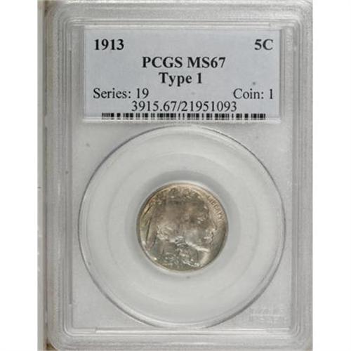 <B>1913 5C Type One MS67 PCGS.</B></I> A fusion of peach-gold and ice-blue iridescent toning defines the eye appeal of this blazing Superb Gem Type One Buffalo nickel. Thus far, only 12 pieces have been graded finer at PCGS (12/07).<BR><BR><B>Coin Engraver:</B> James E. Fraser<BR><BR><b>Shipping:</b> Coins & Currency (<a target="_blank" href="http://www.heritageauctions.com/common/shipping.php">view shipping information</a>)