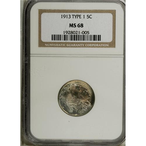<B>1913 5C Type One MS68 NGC.</B></I> Though vast numbers of 1913 Type One nickels were saved by the public, few had such careful custodianship as this "wonder coin." Without magnification, it is impossible to pick out more than one or two possible flaws on the surfaces. Boldly impressed and highly lustrous with captivating jade-green, gold, and pinkish-orange patina. Census: 9 in 68, 0 finer (12/06).<BR><BR><b>Shipping:</b> Coin/Currency (<a target="_blank" href="http://www.heritageauctions.com/common/shipping.php">view shipping information</a>)