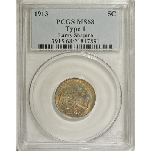 <B>1913 5C Type One MS68 PCGS.</B></I> Ex: Larry Shapiro. This example is one of less than a dozen that PCGS has certified as MS68, the highest quality seen by either NGC or PCGS. Both sides have a full strike with intense mint frost beneath pleasing gold and iridescent toning. The surfaces have a texture similar to matte proof examples, although the difference between proofs and mint state pieces is unmistakable. The present sale offers two different MS68 examples of this date, the first issue in the Buffalo nickel series. Population: 11 in 68, 0 finer (3/07).<BR><BR><b>Shipping:</b> Coins & Currency (<a target="_blank" href="http://www.heritageauctions.com/common/shipping.php">view shipping information</a>)