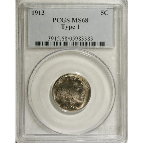 <B>1913 5C Type One MS68 PCGS.</B></I> The fields of all Type One Buffalo nickels, not just the proof coins, show the textured fields as on James Earle Fraser's original models, and therefore they give the coins' luster a "shimmering quality, particularly on unworn dies," according to Lange. In fact, "first strikes from unworn dies are easily mistaken for proofs and vice versa." This coin is, however, an unmistakable circulation strike, as it lacks the fully squared rims on the inside margin that a proof exhibits. It is nonetheless an extraordinary piece, showing a strike that is nearly full but shows a tad of softness on the letter tops of LIBERTY. There is also some light die clashing obvious on both sides, if only under a loupe. The coloration is a scintillating combination of lilac, ice-blue, and light olive. Although the die is obviously not unworn or unused, both the luster and overall state of preservation of this remarkable coin are really quite extraordinary. Population: 11 in 68, 0 finer (3/07).<BR><BR><b>Shipping:</b> Coins & Currency (<a target="_blank" href="http://www.heritageauctions.com/common/shipping.php">view shipping information</a>)