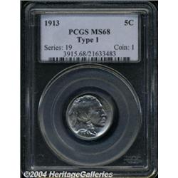 <B>1913<5C> Type One MS68 PCGS.</B></I> This example shows pale violet, powder blue, and light gold toning over vibrant luster, which is given a shimmering quality by the textured surfaces. Sharply struck, with even LIBERTY and the obverse rim portraying relatively nice detail, these features usually showing weakness on this issue. Pristine surfaces are immaculately preserved. <BR><BR><B>Important notice:</B> Heritage usually auctions material at the rate of 200-250 lots per hour. On some occasions eBay Live bid software or the Internet may not be able to keep up with the pace of the auction. We recommend placing a realistic absentee bid now as insurance to avoid disappointment. Occasionally the auctioneer may eliminate or reject an eBay Live bid, and the auctioneer may also reopen a lot after the close of the eBay live bidding (usually because we missed an audience bid), and may reject your bid even if it shows you as the winning bidder. By bidding via eBay Live, you agree that Heritage may award the lot to another bidder at its sole discretion under the circumstances described above or any other reasonable circumstances. Since eBay bids are not shown to us until we open the lot on the floor, we treat those bids just like floor bids. In most cases the floor responds before the eBay bid is presented to us, due to Internet lag time, so for consistency we have made it a policy that floor bids are always considered first over tie eBay live bids. Also please note that all Heritage lots purchased through eBay Live carry a 20% Buyer's Premium. Please make sure you read the Terms and Conditions before you bid. </span></font></tr></table></td></tr></table>