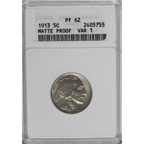 <B>1913 5C Type One PR62 ANACS.</B></I> The sharpness of the rims and the design elements, particularly those around the borders, confirm the proof status. There is a thin coat of champagne color on each side, with powder-blue accents on the reverse. A pretty coin, perhaps conservatively graded.<BR><BR><b>Shipping:</b> Coins & Currency (<a target="_blank" href="http://www.heritageauctions.com/common/shipping.php">view shipping information</a>)