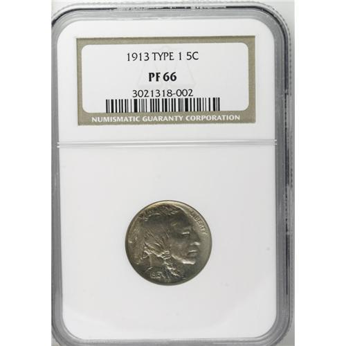 <B>1913 5C Type One PR66 NGC.</B></I> This Premium Gem displays the granular finish characteristic of the Type One matte proofs. A medley of delicate light ice-blue and gold-beige patina covers the obverse, while the reverse assumes a similar color pattern with slightly deeper hues. Boldly struck design elements affirm the proof status of this wonderful piece, whose great eye appeal is further enhanced by impeccably preserved surfaces. Census: 91 in 66, 37 finer (11/06).<BR><BR><b>Shipping:</b> Coin/Currency (<a target="_blank" href="http://www.heritageauctions.com/common/shipping.php">view shipping information</a>)