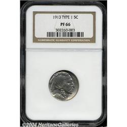 <B>1913<5C> Type One PR66 NGC.</B></I> Satiny, with the pebbly surfaces associated with the early matte proof Buffalo nickels, and broad, square rims on both sides. A generally untoned appearance greets the viewer. This is an attractive coin that is sure to please even the most condition-conscious collector. <BR><BR><B>Important notice:</B> Heritage usually auctions material at the rate of 200-250 lots per hour. On some occasions eBay Live bid software or the Internet may not be able to keep up with the pace of the auction. We recommend placing a realistic absentee bid now as insurance to avoid disappointment. Occasionally the auctioneer may eliminate or reject an eBay Live bid, and the auctioneer may also reopen a lot after the close of the eBay live bidding (usually because we missed an audience bid), and may reject your bid even if it shows you as the winning bidder. By bidding via eBay Live, you agree that Heritage may award the lot to another bidder at its sole discretion under the circumstances described above or any other reasonable circumstances. Since eBay bids are not shown to us until we open the lot on the floor, we treat those bids just like floor bids. In most cases the floor responds before the eBay bid is presented to us, due to Internet lag time, so for consistency we have made it a policy that floor bids are always considered first over tie eBay live bids. Also please note that all Heritage lots purchased through eBay Live carry a 20% Buyer's Premium. Please make sure you read the Terms and Conditions before you bid.