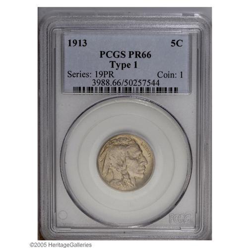 <B>1913<5C> Type One PR66 PCGS.</B></I> First year of issue for the Buffalo nickel, first year of matte proof production in this metal, and the only year of production for the Type One design make this a perennially popular type coin with collectors. The design elements show pinpoint detailing and the surfaces have the pleasing satiny appearance and pebbly surface textures of matte proofs. Pale rose, steel-green, and yellow-gold patina covers both sides of this immaculate Premium Gem.
