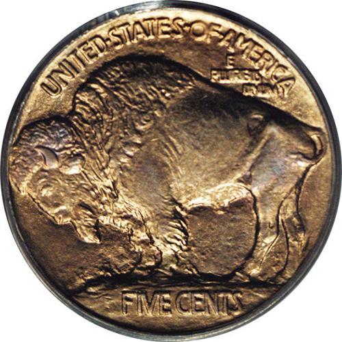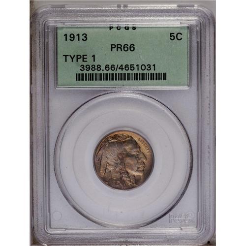 <B>1913<5C> Type One PR66 PCGS.</B></I> Struck with pinpoint sharpness with both sides blanketed in rich apricot patina. A few isolated splashes of violet and blue are noticed on the bison. Population: 75 in 66, 39 finer (3/06). <BR><BR><B>Important notice:</B> Heritage usually auctions material at the rate of 200-250 lots per hour. On some occasions eBay Live bid software or the Internet may not be able to keep up with the pace of the auction. We recommend placing a realistic absentee bid now as insurance to avoid disappointment. Occasionally the auctioneer may eliminate or reject an eBay Live bid, and the auctioneer may also reopen a lot after the close of the eBay live bidding (usually because we missed an audience bid), and may reject your bid even if it shows you as the winning bidder. By bidding via eBay Live, you agree that Heritage may award the lot to another bidder at its sole discretion under the circumstances described above or any other reasonable circumstances. Since eBay bids are not shown to us until we open the lot on the floor, we treat those bids just like floor bids. In most cases the floor responds before the eBay bid is presented to us, due to Internet lag time, so for consistency we have made it a policy that floor bids are always considered first over tie eBay live bids. Also please note that all Heritage lots purchased through eBay Live carry a 20% Buyer's Premium. Please make sure you read the Terms and Conditions before you bid. This lot is being auctioned in conjunction with a live floor auction by Heritage Galleries & Auctioneers. All final auction and invoice information will be supplied by Heritage Galleries & Auctioneers, and all other information should be considered preliminary. Lot:1148 <BR><BR><B>Winning Notification and Billing:</B> After the FINAL session in this auction is complete, Heritage will send e-mail and snail mail invoices. This process normally takes several days. All final auction and invoice information will be supplied by Heritage Galleries & Auctioneers, and all other information should be considered preliminary. <BR><BR>This auction will be conducted on a live auction floor and over the Internet through eBay Live. If you choose to place an absentee bid, please take a moment to <font color='#0000ff'><u><a href='http://pages.ebay.com/liveauctions/help/before/laabsentee.html'>learn how eBay Live absentee bidding works</a></u></font><font color='#000000'>