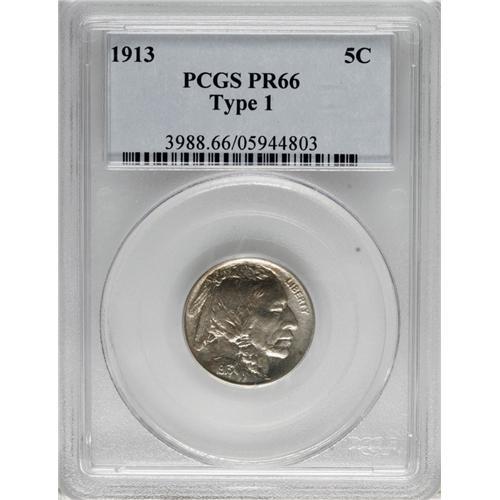 <B>1913 5C Type One PR66 PCGS.</B></I> The typically seen finely-grained satiny finish displays barely discernible champagne-gold color and pleasing luster. A sharp, even strike is apparent throughout all of the design elements, and each side is quite well preserved. A small, inoffensive toning spot is noted in the lower right obverse field. Population: 80 in 66, 42 finer (3/07).<BR><BR><b>Shipping:</b> Coins & Currency (<a target="_blank" href="http://www.heritageauctions.com/common/shipping.php">view shipping information</a>)
