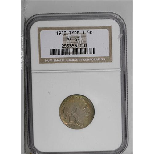 <B>1913<5C> Type One PR67 NGC.</B></I> A lovely matte proof striking of the premier Buffalo Nickel delivery from the Philadelphia Mint. Exquisitely toned in apple-green, gold, rose, and lilac hues. The strike is razor sharp over all major design elements. Only the closely spaced letters in E PLURIBUS UNUM exhibit any detectable softness. Thorough evaluation locates only a single pinpoint toning fleck, beneath the jaw of the Native American. The pristine and obviously original surfaces should endear this coin to an advanced specialist who appreciates originality as well as technical quality. The 1913 Type One is requisite for a proof type collection, although the designs have been borrowed for various modern commemorative and bullion issues. Census: 33 in 67, 2 finer (7/06).