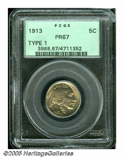 <B>1913<5C> Type One PR67 PCGS.</B></I> A fine specimen striking of the 1913 Type One Nickel, this coin is softly toned in champagne-gray shades that lightly blanket each side. With satiny textured surfaces and no die polish lines, this example is unmistakable as a proof. There is not a single blemish of note, and the eye appeal is equally as strong as the technical merits. This lot represents a fleeting opportunity for the PCGS Registry Set collector. Population: 36 in 67, 2 finer (5/05).