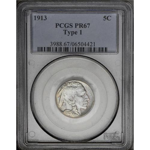 <B>1913<5C> Type One PR67 PCGS.</B></I> A sharply struck and highly attractive matte proof example with mostly pale blue color accented by light golden-yellow toning. This is one of the first Buffalo nickels struck, and all of the fine details of the design are fully present. The surfaces are pristine, and this piece is essentially the same as it was when struck. <BR><BR><B>Important notice:</B> Heritage usually auctions material at the rate of 200-250 lots per hour. On some occasions eBay Live bid software or the Internet may not be able to keep up with the pace of the auction. We recommend placing a realistic absentee bid now as insurance to avoid disappointment. Occasionally the auctioneer may eliminate or reject an eBay Live bid, and the auctioneer may also reopen a lot after the close of the eBay live bidding (usually because we missed an audience bid), and may reject your bid even if it shows you as the winning bidder. By bidding via eBay Live, you agree that Heritage may award the lot to another bidder at its sole discretion under the circumstances described above or any other reasonable circumstances. Since eBay bids are not shown to us until we open the lot on the floor, we treat those bids just like floor bids. In most cases the floor responds before the eBay bid is presented to us, due to Internet lag time, so for consistency we have made it a policy that floor bids are always considered first over tie eBay live bids. Also please note that all Heritage lots purchased through eBay Live carry a 20% Buyer's Premium. Please make sure you read the Terms and Conditions before you bid. This lot is being auctioned in conjunction with a live floor auction by Heritage Galleries & Auctioneers. All final auction and invoice information will be supplied by Heritage Galleries & Auctioneers, and all other information should be considered preliminary. Lot:1149 <BR><BR><B>Winning Notification and Billing:</B> After the FINAL session in this auction is complete, Heritage will send e-mail and snail mail invoices. This process normally takes several days. All final auction and invoice information will be supplied by Heritage Galleries & Auctioneers, and all other information should be considered preliminary. <BR><BR>This auction will be conducted on a live auction floor and over the Internet through eBay Live. If you choose to place an absentee bid, please take a moment to <font color='#0000ff'><u><a href='http://pages.ebay.com/liveauctions/help/before/laabsentee.html'>learn how eBay Live absentee bidding works</a></u></font><font color='#000000'>