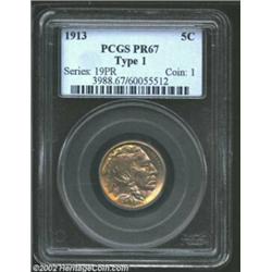 1913 5C Type One PR67 PCGS. Another, and even finer specimen striking of the 1913 Type One Nickel, t