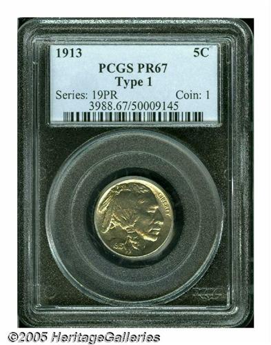 <B>1913<5C> Type One PR67 PCGS.</B></I> Technical merit and strong overall visual appeal are combined on this single matte proof striking. Pinpoint striking details are also noted on all the design elements, and a wide swath of cinnamon-brown toning runs vertically down the center of each side. In addition, each side appears to be free from any trace of carbon--a very desirable and rare attribute on proof nickels.<BR><I>From The Melrose Bay Collection.</B></I>