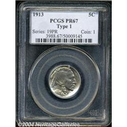 <table><tbody><tr><td><table> <TR><TD width="100%"><TABLE cellSpacing=1 cellPadding=3 width="100%" border=0><TBODY><TR><TD width="100%" bgColor=#79735c><FONT face=arial color=#ffffff size=3><B>Description</B> </FONT></TD></TR><TR><TD width="100%" bgColor=#ffffff><FONT face=arial size=2><B>1913 5C Type One PR67 PCGS.</B></I> Technical merit and strong overall visual appeal are combined on this single matte proof striking. Pinpoint striking details are also noted on all the design elements, and a wide swath of cinnamon-brown toning runs vertically down the center of each side. In addition, each side appears to be free from any trace of carbon--a very desirable and rare attribute on proof nickels. </FONT></TD></TR></TBODY></TABLE></TD></TR></TBODY></TABLE><BR><A name=PricesRealized></A><TABLE cellSpacing=0 cellPadding=0 width="100%" bgColor=#000000 border=0><TBODY><TR><TD width="100%"><TABLE cellSpacing=1 cellPadding=3 width="100%" border=0><TBODY><TR><TD width="100%" bgColor=#79735c><A name=PR><FONT face=arial color=#ffffff size=3><B>Previous Prices from Heritage Auctions</B> </FONT></A></TD></TR><TR><TD bgColor=#f6f6ed><TABLE cellSpacing=0 cellPadding=0 width="100%" border=1><TBODY><TR><TD align=middle width="33%"><B>Date</B></TD><TD align=middle width="33%"><B>Service</B></TD><TD align=middle width="33%"><B>Price</B></TD></TR><TR bgColor=whitesmoke><TD width="33%"><B>11/07/2003</B></TD><TD width="33%">PCGS</TD><TD width="33%">$7,475.00</TD></TR><TR bgColor=whitesmoke><TD width="33%"><B>09/20/2003</B></TD><TD width="33%">PCGS</TD><TD width="33%">$9,775.00</TD></TR><TR bgColor=whitesmoke><TD width="33%"><B>07/29/2003</B></TD><TD width="33%">NGC</TD><TD width="33%">$5,750.00</TD></TR><TR bgColor=whitesmoke><TD width="33%"><B>07/29/2003</B></TD><TD width="33%">PCGS</TD><TD width="33%">$8,050.00</TD></TR><TR bgColor=whitesmoke><TD width="33%"><B>03/01/2003</B></TD><TD width="33%">PCGS</TD><TD width="33%">$7,187.50</TD></TR><TR bgColor=whitesmoke><TD width="33%"><B>01/11/2003</B></TD><TD width="33%">PCGS</TD><TD width="33%">$6,325.00</TD></TR><TR bgColor=whitesmoke><TD width="33%"><B>01/11/2003</B></TD><TD width="33%">NGC</TD><TD width="33%">$4,600.00</TD></TR><TR bgColor=whitesmoke><TD width="33%"><B>02/23/2001</B></TD><TD width="33%">NGC</TD><TD width="33%">$4,140.00</TD></TR><TR bgColor=whitesmoke><TD width="33%"><B>01/07/2000</B></TD><TD width="33%">NGC</TD><TD width="33%">$3,450.00</TD></TR><TR bgColor=whitesmoke><TD width="33%"><B>08/07/1998</B></TD><TD width="33%">PCGS</TD><TD width="33%">$4,370.00</TD></TR><TR bgColor=whitesmoke><TD width="33%"><B>08/17/1996</B></TD><TD width="33%">NGC</TD><TD width="33%">$2,860.00</TD></TR><TR bgColor=whitesmoke><TD width="33%"><B>08/17/1996</B></TD><TD width="33%">NGC</TD><TD width="33%">$2,530.00</TD></TR><TR bgColor=whitesmoke><TD width="33%"><B>04/26/1996</B></TD><TD width="33%">NGC</TD><TD width="33%">$3,190.00</TD></TR><TR bgColor=whitesmoke><TD width="33%"><B>10/07/1995</B></TD><TD width="33%">PCGS</TD><TD width="33%">$6,160.00</TD></TR><TR bgColor=whitesmoke><TD width="33%"><B>02/05/1994</B></TD><TD width="33%">NGC</TD><TD width="33%">$2,860.00</TD></TR><TR bgColor=whitesmoke><TD width="33%"><B>03/21/2002</B></TD><TD width="33%">NGC</TD><TD width="33%">$5,520.00</TD></TR><TR bgColor=whitesmoke><TD width="33%"><B>02/01/1999</B></TD><TD width="33%">NGC</TD><TD width="33%">$3,680.00</TD></TR><TR bgColor=whitesmoke><TD width="33%"><B>06/01/1997</B></TD><TD width="33%">PCGS</TD><TD width="33%">$4,620.00</TD></TR><TR bgColor=whitesmoke><TD width="33%"><B>03/01/2000</B></TD><TD width="33%">PCGS</TD><TD width="33%">$5,520.00</TD></TR></TBODY></TABLE></TD></TR><TR><TD bgColor=#ffffff><FONT face=arial size=1 ?>PLEASE NOTE: All prices realized reflect the final hammer price PLUS the buyer's premium in auctions that charge a buyer's premium. Each item has a notation at the top of the listing indicating whether that lot included a buyer's premium. Example: A item that sells with a final hammer price of $100 and a 20% buyer's premium will display with a price realized of $120. All information listed is intended to be as accurate as possible, but errors are possible. Please use this guide carefully and inform us of any inaccuracies. </FONT></TD></TR></TBODY></TABLE></TD></TR></TBODY></TABLE><BR><TABLE cellSpacing=0 cellPadding=0 width="100%" bgColor=#000000 border=0><TBODY><TR><TD width="100%"><TABLE cellSpacing=1 cellPadding=3 width="100%" border=0><TBODY><TR><TD width="100%" bgColor=#79735c colSpan=6><FONT face=arial color=#ffffff size=3><B>Price Guide*</B> </FONT></TD></TR><TR bgColor=#f6f6ed><TD align=middle><B>Grade</B> </TD><TD align=middle><B>Coin World<BR>(Trends)</B> </TD><TD align=middle><B>Numismedia<BR>Retail</B> </TD><TD align=middle><B>Numismedia<BR>Wholesale</B> </TD><TD align=middle><B>Coin<BR>Universe</B> </TD><TD align=middle><B>Heritage<BR>Value Index</B> </TD></TR><TR bgColor=#ffffff><TD align=middle>66</TD><TD align=right>---</TD><TD align=right>---</TD><TD align=right>$2,900.00</TD><TD align=right>$3,900.00</TD><TD align=right>$2,640.00</TD></TR><TR style="FONT-WEIGHT: bold" bgColor=#cccfdd><TD align=middle>67</TD><TD align=right>---</TD><TD align=right>---</TD><TD align=right>$6,275.00</TD><TD align=right>$10,000.00</TD><TD align=right>$7,280.00</TD></TR><TR bgColor=#ffffff><TD align=middle>68</TD><TD align=right>---</TD><TD align=right>---</TD><TD align=right>---</TD><TD align=right>---</TD><TD align=right>---</TD></TR><TR bgColor=#ffffff><TD colSpan=6><FONT size=1>*All information listed is intended to be as accurate as possible, but errors are possible. No item may be returned or refused based on this information which is provided as a service to our customers. You should contact each pricing source directly to determine the accuracy of this information. </FONT></TD></TR></TBODY></TABLE></TD></TR></TBODY></TABLE><BR><TABLE cellSpacing=0 cellPadding=0 width="100%" bgColor=#000000 border=0><TBODY><TR><TD width="100%"><TABLE cellSpacin