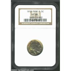 1913 5C Type One PR68 NGC. One would be hard pressed to locate a more attractive proof 1913 Type One Nickel, even if there were a coin certified finer than PR68 at NGC or PCGS. The toning is truly extraordinary with orange, red, gold, powder-blue, and champagne colors moving from the left borders to the right. There is an added blush of lilac-pink iridescence over the Indian's cheek on the obverse. The fully brought up features are perhaps most praiseworthy on the bison's tail. Fine-grained satin texture blankets all areas with not a single blemish of note. This is the single finest NGC-certified proof 1913 Type One Buffalo Nickel, and it is matched, but not bettered, by one other coin at PCGS (1/03). In the 2000 book The Complete Guide to Buffalo Nickels, David W. Lange spills a considerable amount of ink on the difficulty that numismatists have always had distinguishing specimens strikings of this first-year issue from well produced business strikes. This is an important distinction since the failure of collectors to properly make it resulted in the loss of numerous proofs to circulation in the years immediately following delivery. The elusive survivors are most easily attributable today by fullness of strike, the satin texture of the surfaces, and broad borders--all of these features being readily evident on the present Superb Gem.From an East Coast cabinet. Important notice: We expect to be auctioning lots at the rate of 200-250 per hour. On occasion eBay live bid software cannot keep up with the pace of the auctions where 4-5 lots per minute can hammer down, so we recommend that you place a realistic absentee bid now as insurance to avoid disappointment. Also please note that all Heritage/CAA lots purchased through eBay Live carry a 20% Buyer's Premium. Please make sure you read the Terms and Conditions.