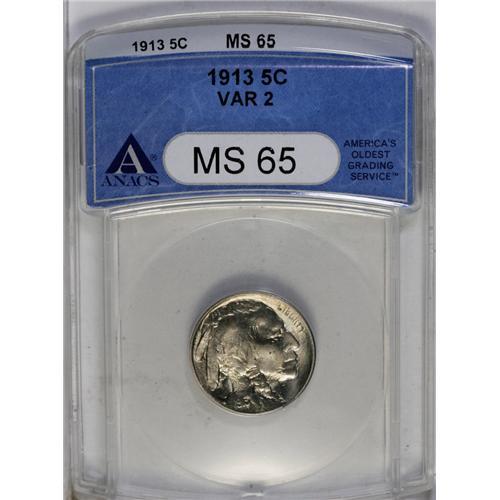 <B>1913<5C> Type Two MS65 ANACS.</B></I> This lustrous light tan-gray Gem is exceptional from a technical perspective. Late dies exhibit orange-peel fields and bold clash marks on each side of the Indian's neck.