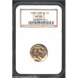 1913 5C Type Two MS65 NGC. Sharply defined with full mint brilliance and a dash of golden patina. The surfaces display only minor imperfections and the overall appearance is superior for the grade. Important notice: We expect to be auctioning lots at the rate of 200-250 per hour. Sometimes eBay Premier live bid software cannot keep up with that pace, so we strongly recommend that you place a realistic proxy bid now as insurance to avoid disappointment. Also please note that all Heritage/CAA lots purchased through eBay Premier carry a 20% Buyer's Premium. Please make sure you read the Terms and Conditions.