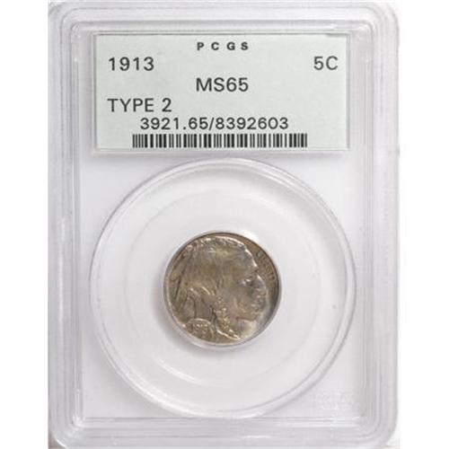 <B>1913 5C Type Two MS65 PCGS.</B></I> PCGS Population (453/165). NGC Census: (275/71). Mintage: 29,858,700. Numismedia Wsl. Price for NGC/PCGS coin in MS65: $273. (#3921)<BR><BR><B>Coin Engraver:</B> James E. Fraser<BR><BR><b>Shipping:</b> Coins & Currency (<a target="_blank" href="http://www.heritageauctions.com/common/shipping.php">view shipping information</a>)