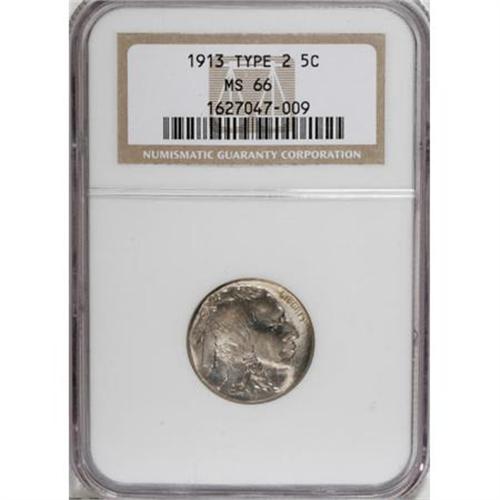 <B>1913 5C Type Two MS66 NGC.</B></I> A well-defined first-year representative from the revised design, strongly lustrous with pale nickel-white surfaces and occasional champagne accents. The Type Two pieces of 1913 are considerably less available than their Type One counterparts. Census: 62 in 66, 8 finer (7/07).<BR><BR><B>Coin Engraver:</B> James E. Fraser<BR><BR><b>Shipping:</b> Coins & Currency (<a target="_blank" href="http://www.heritageauctions.com/common/shipping.php">view shipping information</a>)