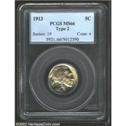 1913 5C Type Two MS66 PCGS. The first 1913-dated Buffalo Nickels of the Type Two design were produced on May 10. Although the public did save some of these coins at the time of issue, much of the hype surrounding the introduction of the Buffalo series had already played itself out after the first of the Type One examples reached general circulation. As a result, the 1913 Type Two is not as plentiful in the finer Mint State grades than its similarly dated Type One counterpart. The fortunate survivor that we are offering in this lot displays shimmering mint luster with delicate golden tinged iridescence. The strike is bold in most areas, and there is not a single mentionable blemish.From The BTB Collection of Buffalo Nickels. Important notice: We expect to be auctioning lots at the rate of 200-250 per hour. Sometimes eBay Premier live bid software cannot keep up with that pace, so we strongly recommend that you place a realistic proxy bid now as insurance to avoid disappointment. Also please note that all Heritage/CAA lots purchased through eBay Premier carry a 20% Buyer's Premium. Please make sure you read the Terms and Conditions.