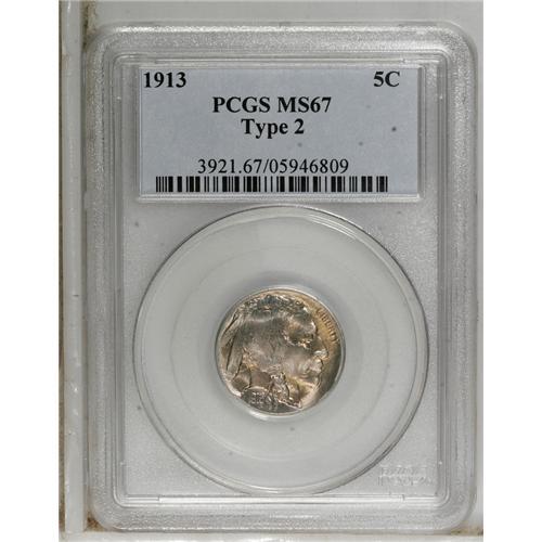 <B>1913 5C Type Two MS67 PCGS.</B></I> David Lange (2000) writes that: "The changeover to the Type 2 reverse was ordered on May 6, and coinage of the revised nickels commenced four days later." Champagne-gold patina bathes highly lustrous surfaces, joined by blushes of delicate violet. A good strike brings up the design elements, better so than is typically seen for the issue. Exceptionally well cared for surfaces add to the coin's lovely eye appeal. Population: 12 in 67, 0 finer (3/07).<BR><BR><b>Shipping:</b> Coins & Currency (<a target="_blank" href="http://www.heritageauctions.com/common/shipping.php">view shipping information</a>)