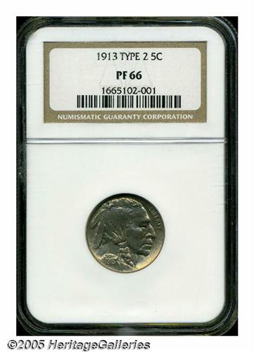 <B>1913<5C> Type Two PR66 NGC.</B></I> A veneer of champagne-gold color portrays faint crimson accents, particularly on the reverse. Bold impressions throughout, and no significant marks. Nice overall eye appeal. Population: 71 in 66, 37 finer (6/05).