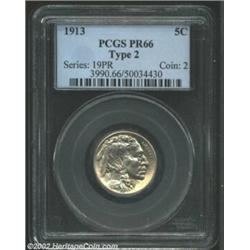 1913 5C Type Two PR66 PCGS. Almost completely brilliant, each side sparkles with thousands of faceted grains of luster from the sandblasted surfaces. This unusual proofing technique was only used for four years, and it literally took decades for collectors to accept it, and to be able to distinguish between a genuine matte proof and a fully struck matte-like business strike. In the meantime, many matte proofs were spent, placed into sets of business strikes, or numismatically abused so they are not recognizable as such today. This is a splendid example that shows no obvious contact marks and no readily apparent carbon spotting. Important notice: We expect to be auctioning lots at the rate of 200-250 per hour. Sometimes eBay Premier live bid software cannot keep up with that pace, so we strongly recommend that you place a realistic proxy bid now as insurance to avoid disappointment. Also please note that all Heritage/CAA lots purchased through eBay Premier carry a 20% Buyer's Premium. Please make sure you read the Terms and Conditions.