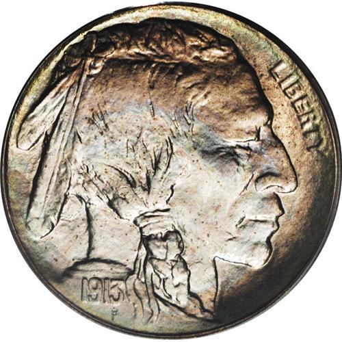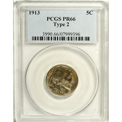 <B>1913 5C Type Two PR66 PCGS.</B></I> This coin is a wonderful first-year specimen, which derives its high grade status as much from superior eye appeal as from outstanding technical merit. The striking details are crisp and essentially full, as expected but not always seen on a proof (only LIBERTY reveals a hint of softness). Variegated gold, salmon, and steel-green coloration adorns the seemingly pristine surfaces.<BR><BR><b>Shipping:</b> Coin/Currency (<a target="_blank" href="http://www.heritageauctions.com/common/shipping.php">view shipping information</a>)