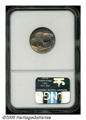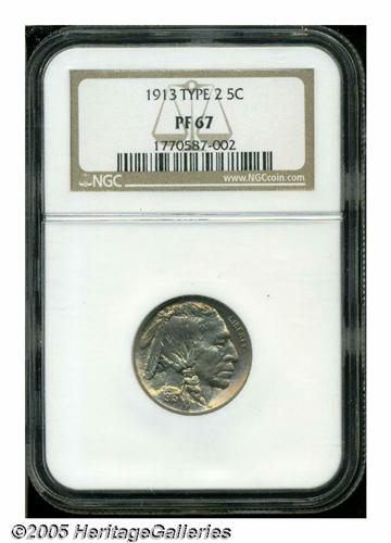 <B>1913<5C> Type Two PR67 NGC.</B></I> A breathtaking matte proof Buffalo, tinted bright rose with flashes of iridescent crimson and lilac color on the reverse. This coin is superbly crafted, very well struck, and exceptionally clean. A better coin would be virtually impossible to locate. Population: 31 in 67, 5 finer (6/05).
