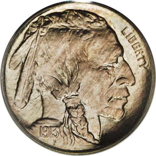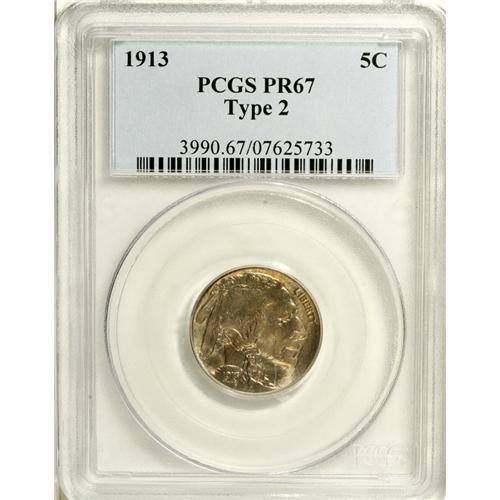 <B>1913 5C Type Two PR67 PCGS.</B></I> The satiny texture of this piece interacts with the slight roughness of the obverse fields to create a fascinating effect that is not duplicated on the reverse. Exquisitely struck with golden toning over much of the piece and significant areas of peacock-blue near the bison. Population: 40 in 67, 4 finer (12/06).<BR><BR><b>Shipping:</b> Coin/Currency (<a target="_blank" href="http://www.heritageauctions.com/common/shipping.php">view shipping information</a>)