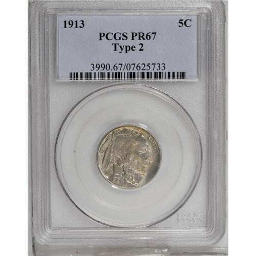 <B>1913<5C> Type Two PR67 PCGS.</B></I> This is a splendid Superb Gem proof with outstanding eye appeal. Although part of a series typically described as Matte proof, this example suggests that the term Satin proof might be more appropriate. Both sides are fully lustrous with finely grained surfaces as coined. All of the design elements on each side are fully defined. Light golden toning adds to the overall eye appeal of this lovely example. Population: 41 in 67, 4 finer (7/06).