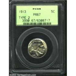 <TABLE cellSpacing=0 cellPadding=0 width="100%" bgColor=#000000 border=0><TBODY><TR><TD width="100%"><TABLE cellSpacing=1 cellPadding=3 width="100%" border=0><TBODY><TR><TD width="100%" bgColor=#79735c><FONT face=arial color=#ffffff size=3><B>Description</B> </FONT></TD></TR><TR><TD width="100%" bgColor=#ffffff><FONT face=arial size=2><B>1913 5C Type Two PR67 PCGS.</B></I> The Type Two 1913 nickel is a somewhat overlooked issue, standing as it does in the shadow of the one-year Type One. It is a curiously scarce issue also, even though 1,514 pieces were struck. The number of certified survivors is so small that Lange (2000) believes a decent number of coins must have been melted as unsold at year's end. Pinpoint striking details characterize this piece along with nearly perfect preservation of the surfaces. This is a coin that can really "face up to a close up." Just put a 16x magnifier over the surfaces and try to find what keeps this coin from an even higher grade. Mostly brilliant, when closely examined one notices there is just the slightest hint of pale rose and lilac coloration present. Population: 38 in 67, 1 finer (4/03). </FONT></TD></TR></TBODY></TABLE></TD></TR></TBODY></TABLE><BR><A name=PricesRealized></A><TABLE cellSpacing=0 cellPadding=0 width="100%" bgColor=#000000 border=0><TBODY><TR><TD width="100%"><TABLE cellSpacing=1 cellPadding=3 width="100%" border=0><TBODY><TR><TD width="100%" bgColor=#79735c><A name=PR><FONT face=arial color=#ffffff size=3><B>Previous Prices from Heritage Auctions</B> </FONT></A></TD></TR><TR><TD bgColor=#f6f6ed><TABLE cellSpacing=0 cellPadding=0 width="100%" border=1><TBODY><TR><TD align=middle width="33%"><B>Date</B></TD><TD align=middle width="33%"><B>Service</B></TD><TD align=middle width="33%"><B>Price</B></TD></TR><TR bgColor=whitesmoke><TD width="33%"><B>01/11/2003</B></TD><TD width="33%">PCGS</TD><TD width="33%">$4,312.50</TD></TR><TR bgColor=whitesmoke><TD width="33%"><B>11/01/1995</B></TD><TD width="33%">PCGS</TD><TD width="33%">$2,530.00</TD></TR><TR bgColor=whitesmoke><TD width="33%"><B>07/30/2002</B></TD><TD width="33%">NGC</TD><TD width="33%">$3,220.00</TD></TR><TR bgColor=whitesmoke><TD width="33%"><B>08/13/1999</B></TD><TD width="33%">NGC</TD><TD width="33%">$2,300.00</TD></TR><TR bgColor=whitesmoke><TD width="33%"><B>01/04/1995</B></TD><TD width="33%">NGC</TD><TD width="33%">$3,190.00</TD></TR><TR bgColor=whitesmoke><TD width="33%"><B>05/03/2003</B></TD><TD width="33%">NGC</TD><TD width="33%">$4,600.00</TD></TR></TBODY></TABLE></TD></TR><TR><TD bgColor=#ffffff><FONT face=arial size=1 ?>PLEASE NOTE: All prices realized reflect the final hammer price PLUS the buyer's premium in auctions that charge a buyer's premium. Each item has a notation at the top of the listing indicating whether that lot included a buyer's premium. Example: A item that sells with a final hammer price of $100 and a 20% buyer's premium will display with a price realized of $120. All information listed is intended to be as accurate as possible, but errors are possible. Please use this guide carefully and inform us of any inaccuracies. </FONT></TD></TR></TBODY></TABLE></TD></TR></TBODY></TABLE><BR><TABLE cellSpacing=0 cellPadding=0 width="100%" bgColor=#000000 border=0><TBODY><TR><TD width="100%"><TABLE cellSpacing=1 cellPadding=3 width="100%" border=0><TBODY><TR><TD width="100%" bgColor=#79735c colSpan=6><FONT face=arial color=#ffffff size=3><B>Price Guide*</B> </FONT></TD></TR><TR bgColor=#f6f6ed><TD align=middle><B>Grade</B> </TD><TD align=middle><B>Coin World<BR>(Trends)</B> </TD><TD align=middle><B>Numismedia<BR>Retail</B> </TD><TD align=middle><B>Numismedia<BR>Wholesale</B> </TD><TD align=middle><B>Coin<BR>Universe</B> </TD><TD align=middle><B>Heritage<BR>Value Index</B> </TD></TR><TR bgColor=#ffffff><TD align=middle>66</TD><TD align=right>---</TD><TD align=right>---</TD><TD align=right>$2,025.00</TD><TD align=right>$2,900.00</TD><TD align=right>$2,142.75</TD></TR><TR style="FONT-WEIGHT: bold" bgColor=#cccfdd><TD align=middle>67</TD><TD align=right>---</TD><TD align=right>---</TD><TD align=right>$3,775.00</TD><TD align=right>$5,200.00</TD><TD align=right>$4,063.33</TD></TR><TR bgColor=#ffffff><TD align=middle>68</TD><TD align=right>---</TD><TD align=right>---</TD><TD align=right>$5,750.00</TD><TD align=right>---</TD><TD align=right>---</TD></TR><TR bgColor=#ffffff><TD colSpan=6><FONT size=1>*All information listed is intended to be as accurate as possible, but errors are possible. No item may be returned or refused based on this information which is provided as a service to our customers. You should contact each pricing source directly to determine the accuracy of this information. </FONT></TD></TR></TBODY></TABLE></TD></TR></TBODY></TABLE><BR><TABLE cellSpacing=0 cellPadding=0 width="100%" bgColor=#000000 border=0><TBODY><TR><TD width="100%"><TABLE cellSpacing=1 cellPadding=3 width="100%" border=0><TBODY><TR><TD width="100%" bgColor=#79735c><FONT face=arial color=#ffffff size=3><B>Population Guide</B> </FONT></TD></TR><TR bgColor=#ffffff><TD align=middle><!-- Begin Output of Population Grid--><TABLE cellSpacing=0 cellPadding=0 width="100%" border=0><TBODY><TR><TD vAlign=center><TABLE cellSpacing=0 width="100%" border=1 cellsadding="3"><TBODY><TR><TD vAlign=center><TABLE cellSpacing=0 cellPadding=3 width="100%" border=1><TBODY><TR><TD vAlign=center align=middle bgColor=#f0f1e8 colSpan=2 <CENTER><FONT face=Arial size=2><B>PCGS Pop </B></FONT><CENTER></CENTER></TD><TD vAlign=center align=middle bgColor=#f0f1e8 colSpan=2><CENTER><FONT face=Arial size=2><B>NGC Pop</B></CENTER></FONT></TD></TR><TR><TD vAlign=center><FONT face=Arial size=2>(67)</FONT> </TD><TD vAlign=center align=right><FONT face=Arial size=2>37</FONT> </TD><TD vAlign=center><FONT face=Arial size=2>(67)</FONT> </TD><TD vAlign=center align=right><FONT face=Arial size=2>30</FONT> </TD></TR><TR><TD vAlign=center><FONT face=Arial size=2>(>67)</FONT> </TD><TD vAlign=center align=right><FONT face=Aria