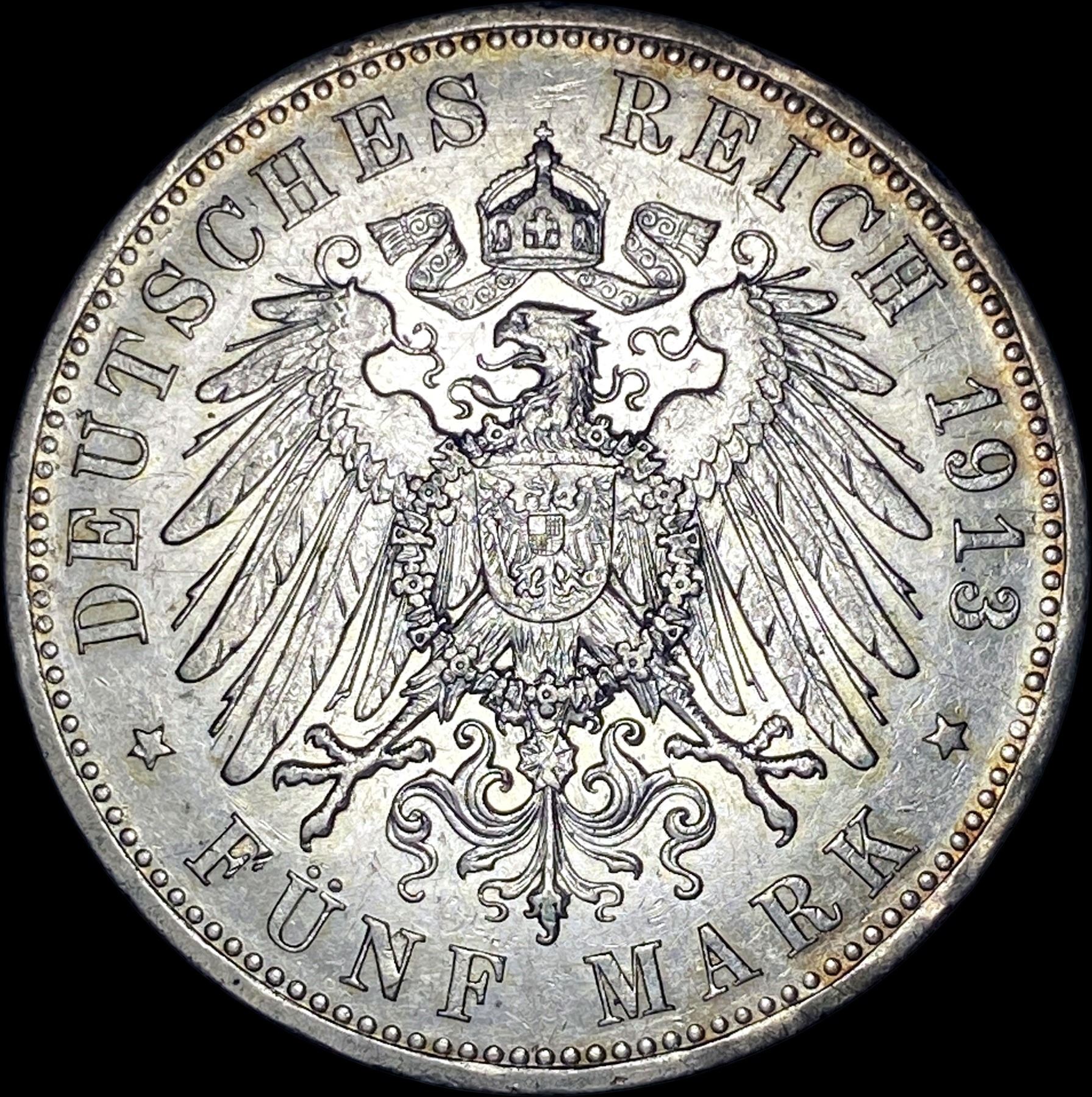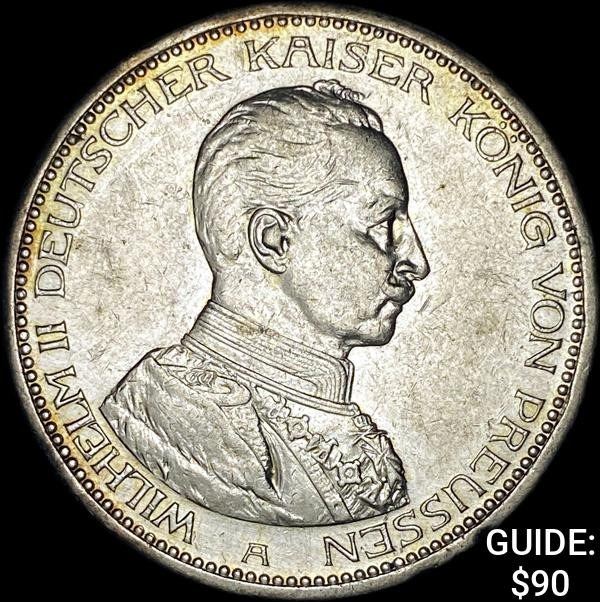1913-A Germany Wilhlm II Silver 5 Reichsmark CLOSELY UNCIRCULATED