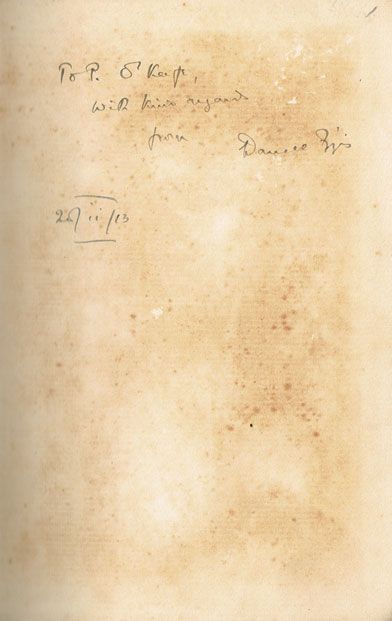 Original boards, Lane, London, 100pp.Inscribed and signed by the author "To P. O'Keefe, with kind regards 20/11/13". P. O'Keefe believed to be Padraig O'Caoimh later a well known member of Sinn Fein along Figgis and an active supporter of the Irish Volunteers.