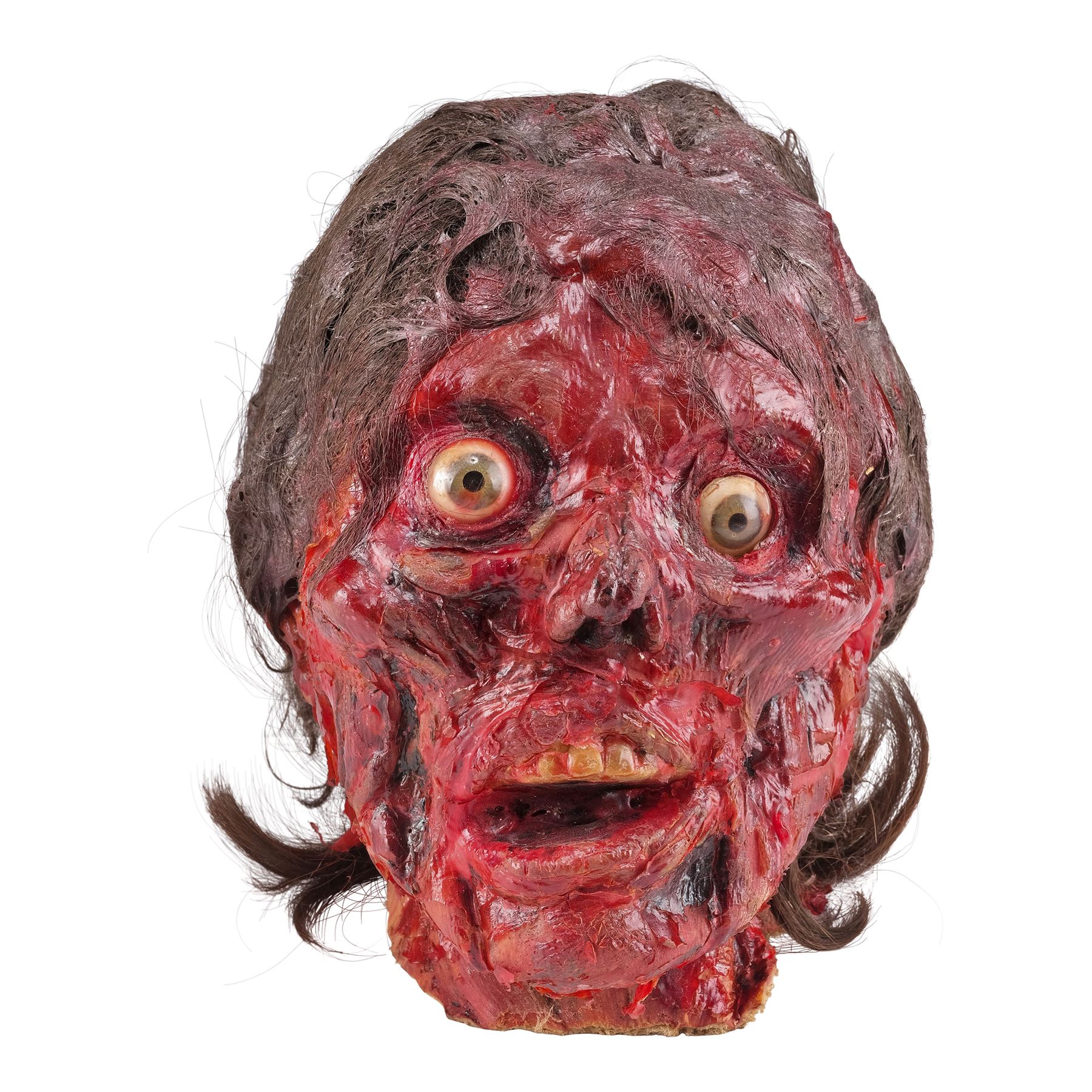 Designed by special makeup effects artist Toby Lindala, this foam-padded head is applied with peeling latex skin, dressed with a synthetic brown and gray hair wig, and inset with detailed plastic eyes. The interior is lined with burlap for maintaining structure. The entire head is intentionally distressed by production to appear warped, rotted, and blood-stained with black streaks down the skeletal cheeks and matting in the hair. The burlap exhibits some fraying around the edges and adhesive residue, while some of the latex is torn from age. Dimensions: 9" x 10" x 8" (23 cm x 25.5 cm x 20.5 cm)