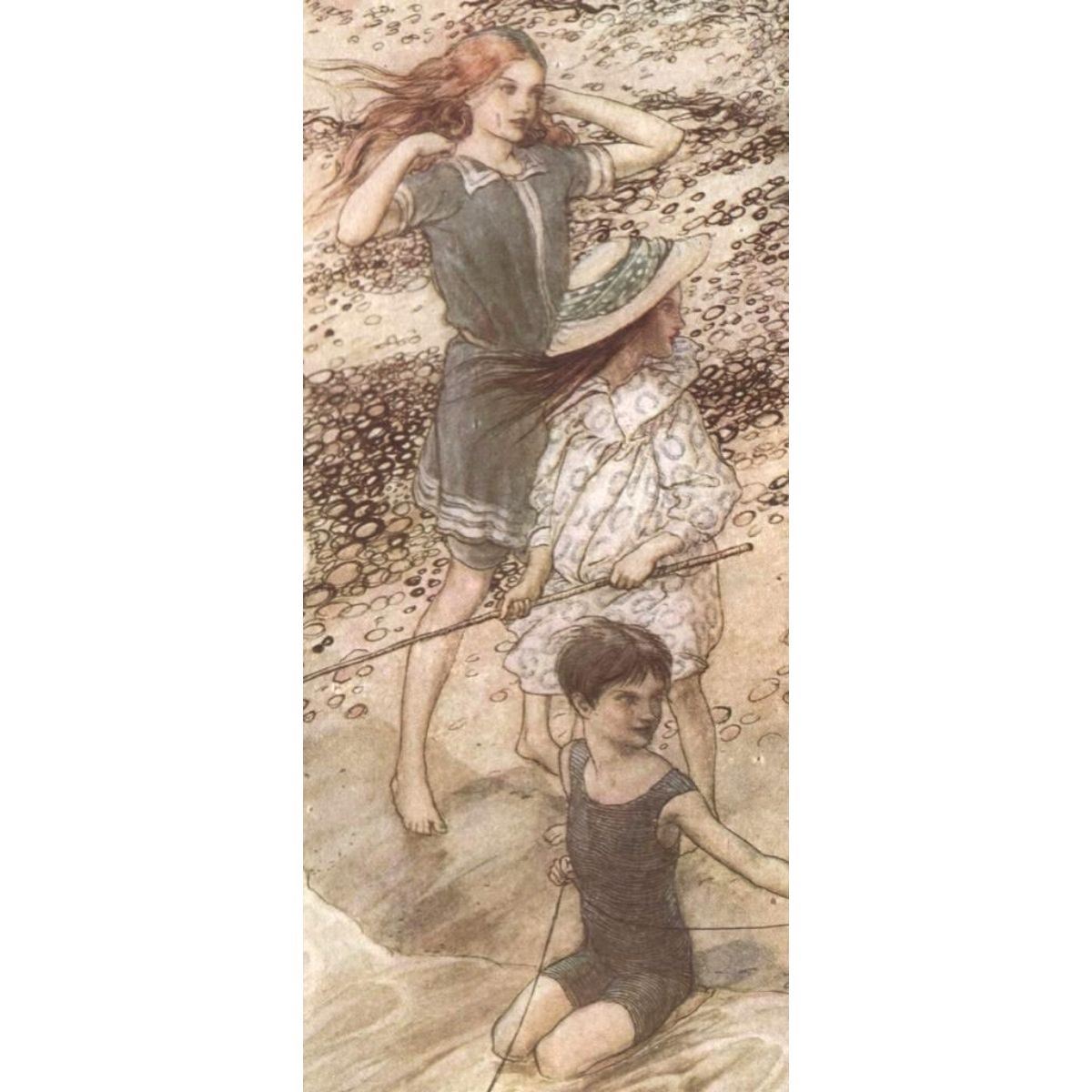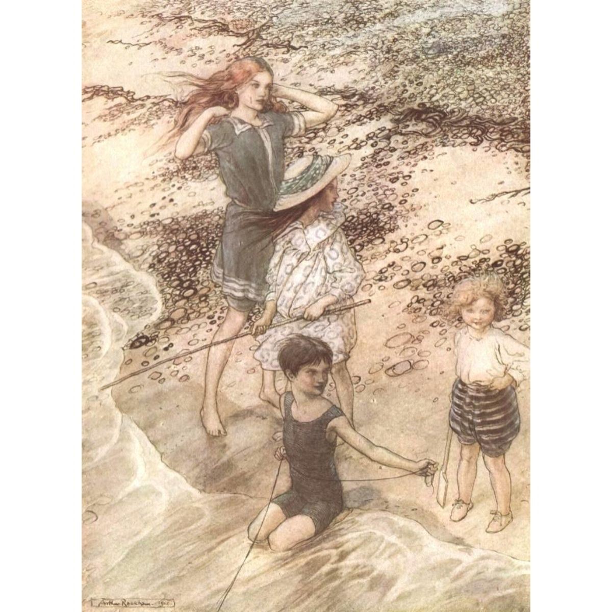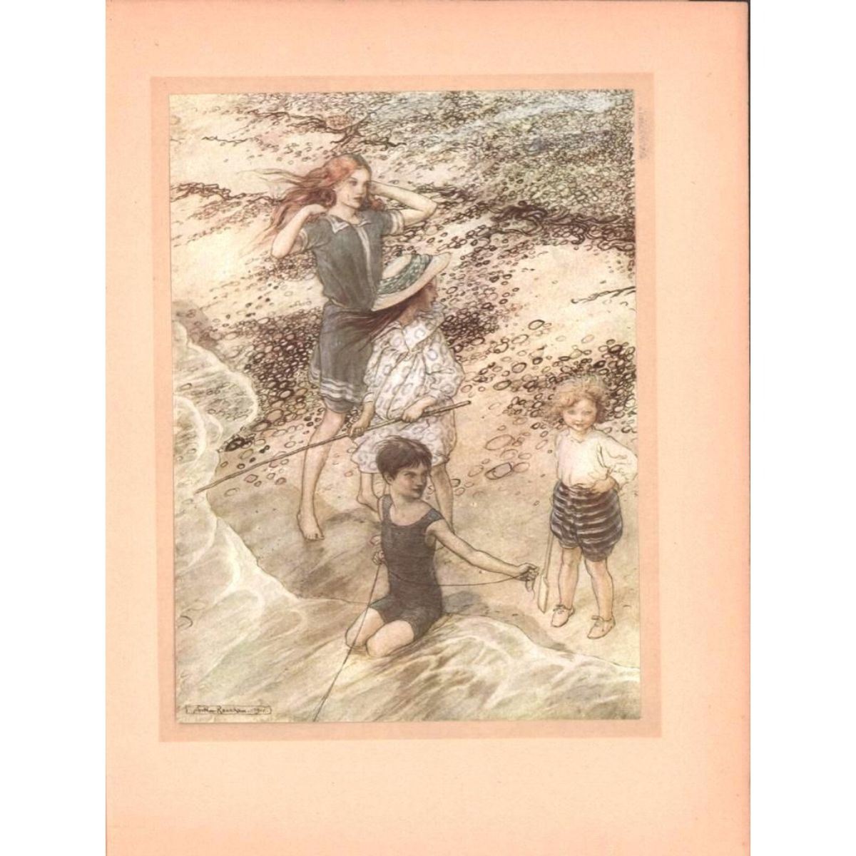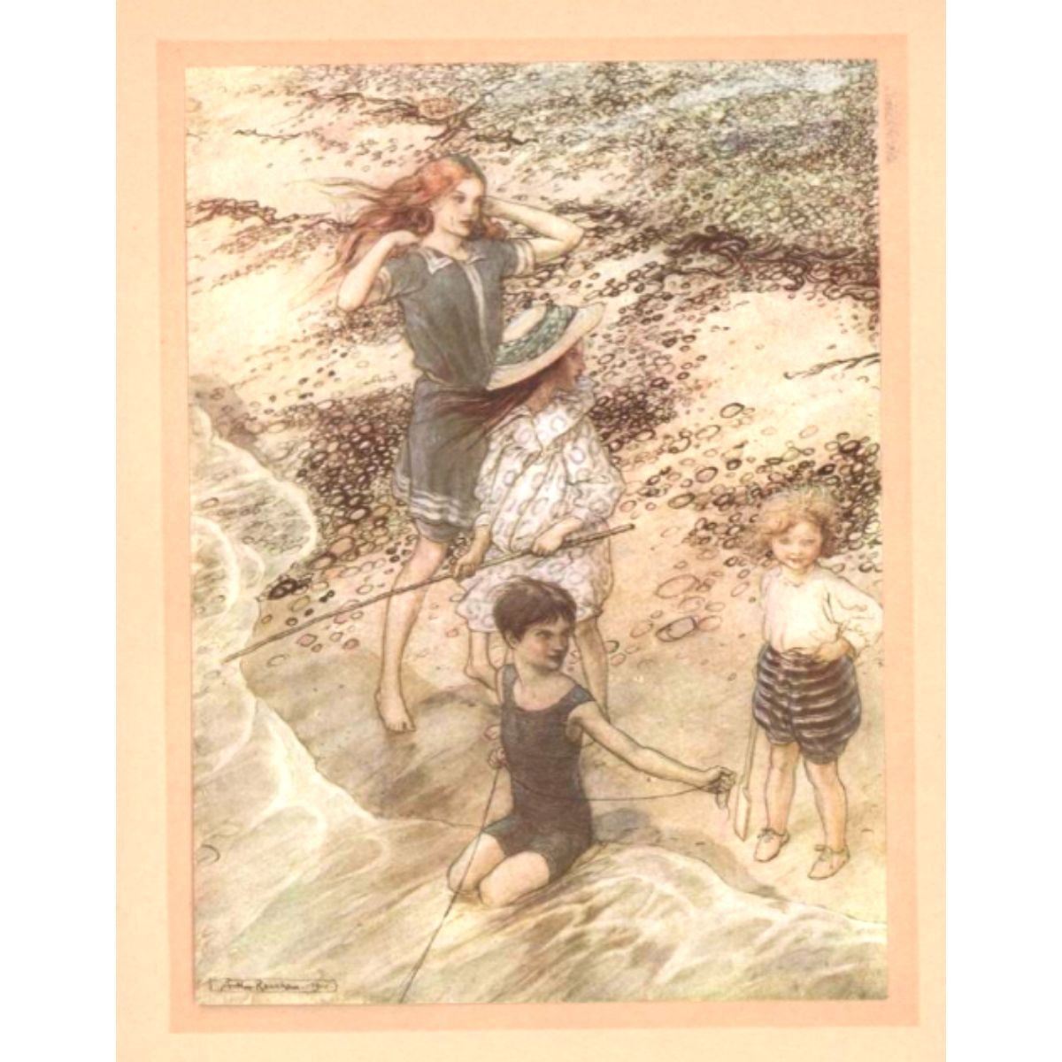 Original 1913 tipped-in color lithograph print, "On The Beach". Bookplate from Arthur Rackman's Book of Pictures, depicts a group of Edwardian children at the beach. Signed in plate. 5 1/2" X 7 1/2".